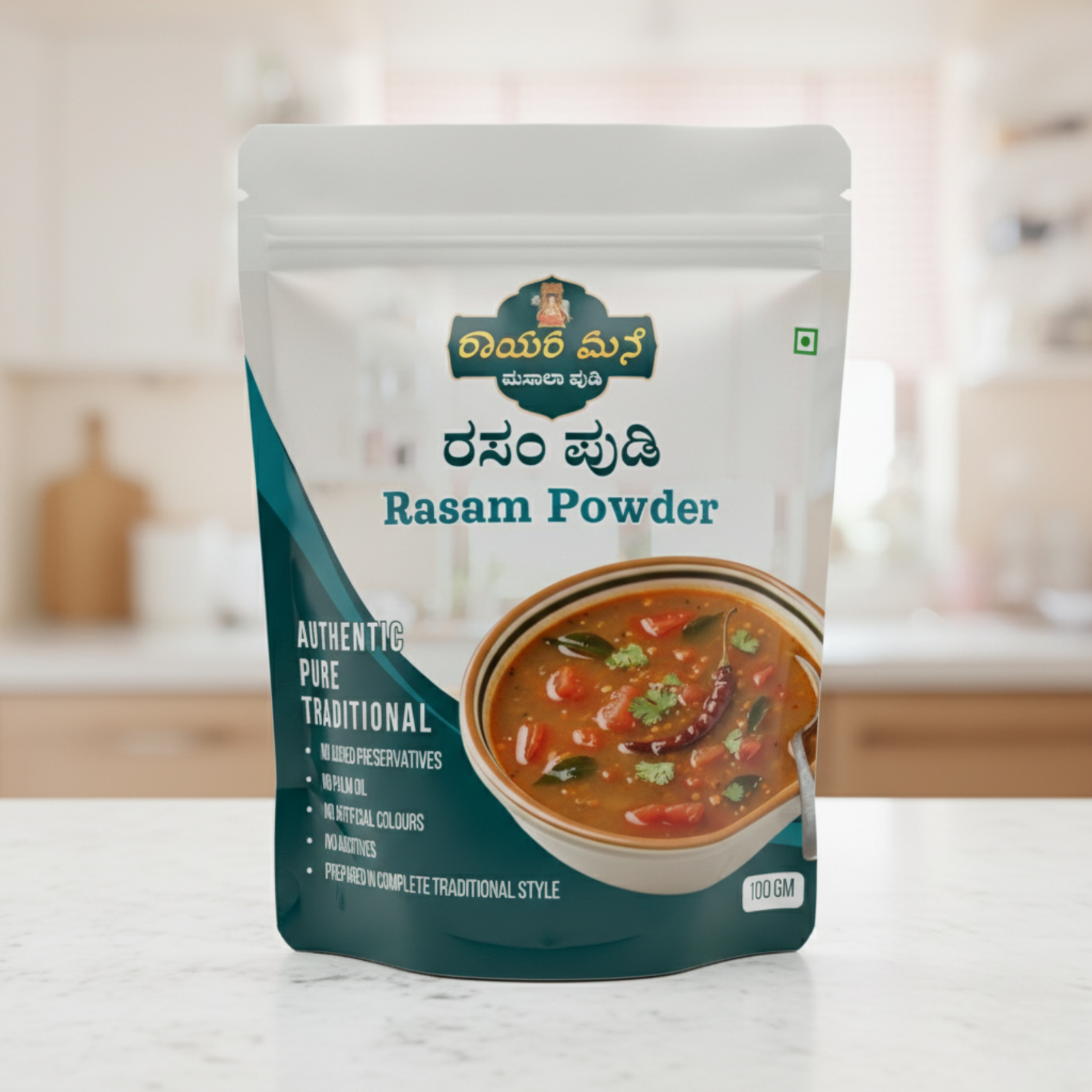 Rayara Mane Rasam Powder combines premium spices like coriander, cumin, pepper, and turmeric for an authentic Karnataka-style rasam. It offers an instant burst of aroma and a comforting homely taste. Ideal for daily cooking.